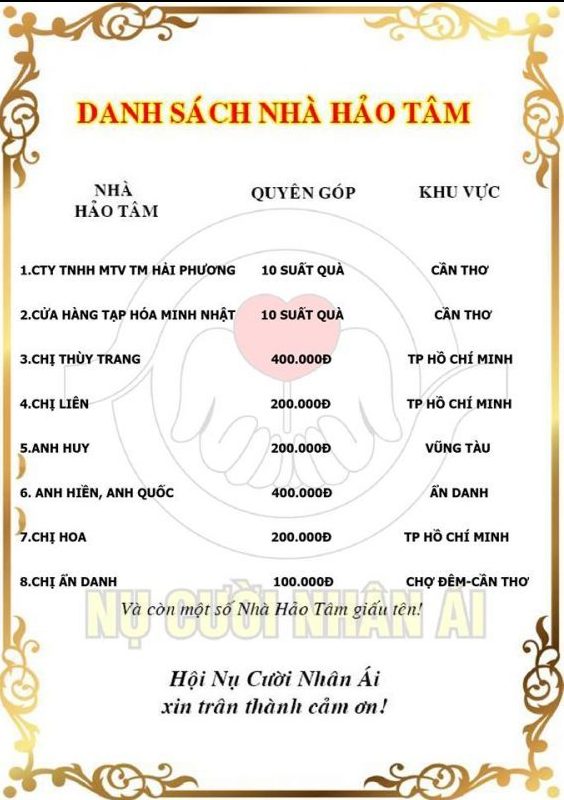 Đây là 1 chương trình GÂY QUỸ, PHÁT QUÀ từ thiện do Nụ Cười Nhân Ái tổ chức, nhằm giúp đỡ những bà con có hoàn cảnh khó khăn tại Phú Thứ – Cần Thơ.